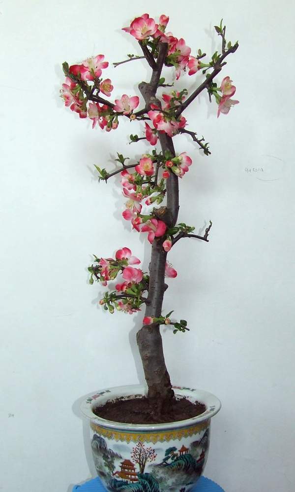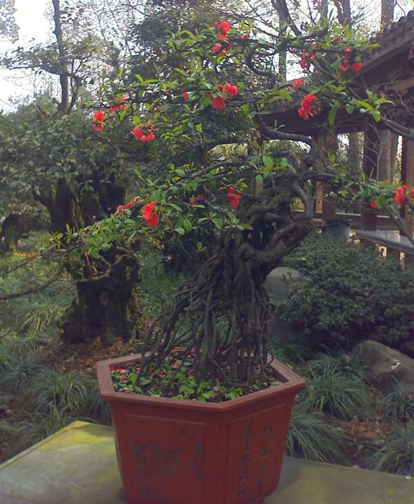 貼梗海棠它又叫作皺皮木瓜,而且還有許多的叫法,是落葉灌木的一種,它在園林綠化上屬于觀花、觀果的優良品種;特別是在花期的時候,滿樹花朵非常的艷麗,顏色多樣;貼梗海棠不但在園林效應上有它的風采,而且它的果實還可以吃,果實營養豐富含維生素多,在醫學上也有它的獨特功效;貼梗海棠在綠化上可以栽種在景區、道路兩邊、庭院等地方;還可以在一些綠化樹中栽種一兩棵貼梗海棠,可以起到點綴的效果,成片的栽種也有不一樣的觀賞效果;它不僅可以地栽也可以制作為盆景,造型多種,常被放置在客廳、花臺、陽臺、門庭邊都可以,下面我們就來欣賞一下它的各種造型盆景吧: